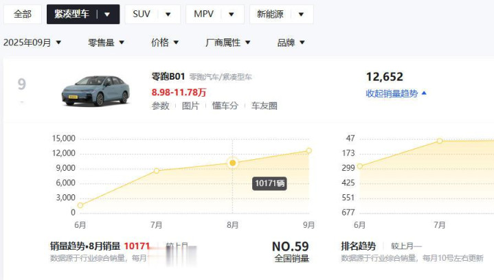 统计下来就那么几台,零跑B01就是其中之一,这台车是今年7月底才正式上市的新车,在纯电紧凑级市场里算是一位“新人”。但这位新人一登场就展现了“黑马”姿态:8月份销量突破1万台,9月份达到了12652台,在10万级紧凑型纯电轿车中稳居第二,获得了大量用户的关注和认可。